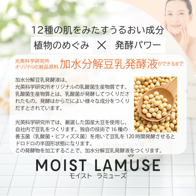光英科学研究所の独自の化粧原料「加水分解豆乳発酵液」※ をふんだんに配合し、植物の恵みや発酵パワーを最大限に活かした12種の美容成分が、潤いに満ちた肌コンディションに導きます。